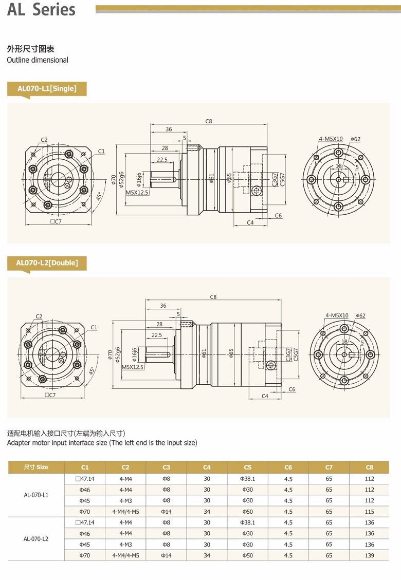 Planetary reducer AL70 series,Model data and dimension drawing of helical gear high precision planetary reducer al70