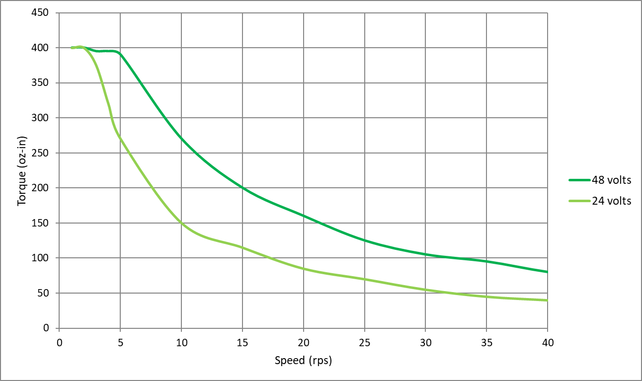 第三個誤區是使用 12 伏電源為步進電機供電。其實無論是任何類型的電動機,電源電壓都與電動機速度直接相關。當向系統提供更高的電壓時,電機會達到更高的速度。如果步進電機被指定為額定電壓,則通常不超過步進電機的繞組電阻乘以額定電流。如在下圖的曲線中可以看到使用 48V 電源時使用 12V 電源,電機將無法達到預期扭矩。