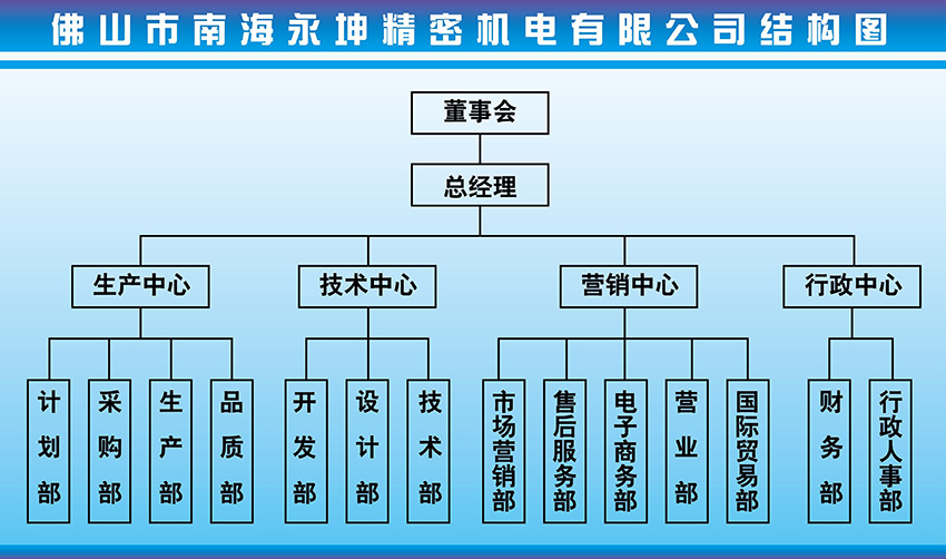 如圖所示,永坤電機廠家最高領導層為董事會,對接重事會日常指令的是總經理,總經理需要對永坤電機公司的日常生產運作作安排和計劃,如生產中心主要是負責按質量按數量生產各種馬達,減速器,電動機制動剎車器等等。技術中心主要負責研發新品類的減速馬達,減速齒輪箱,控制驅動部件,營銷中心主要負責推廣交流馬達,微型電機,直流電機,無刷電動機等細分型下的公司產品,及運營好相應的客戶人員。行政中心主要負責對日常公司開展汲及到的各環節事務。其它依此類推。